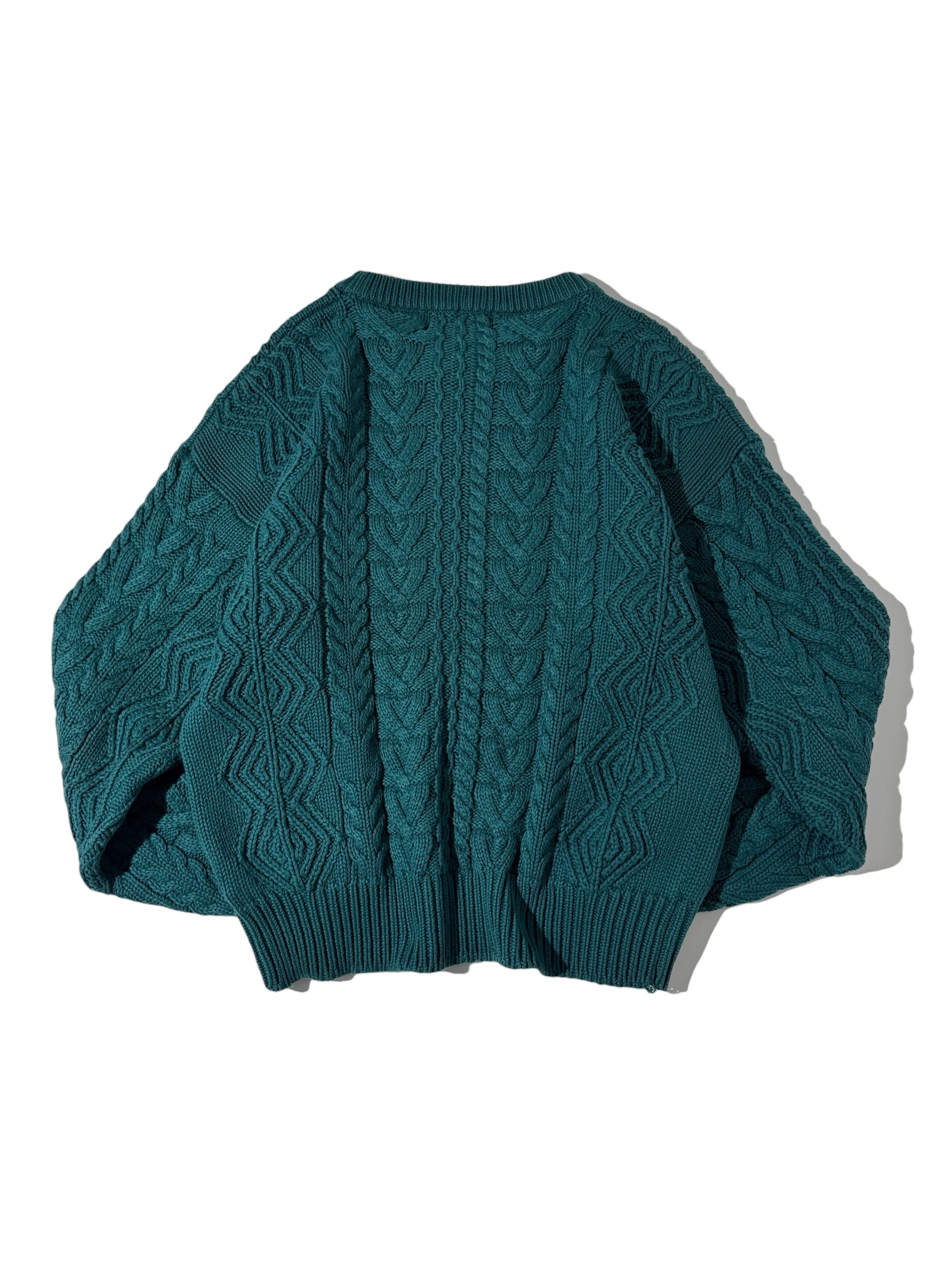 深すぎず、淡すぎない少しネオンのようなグリーンをあえてケーブルニットに使う、シンプルでありながらも大胆な一着。