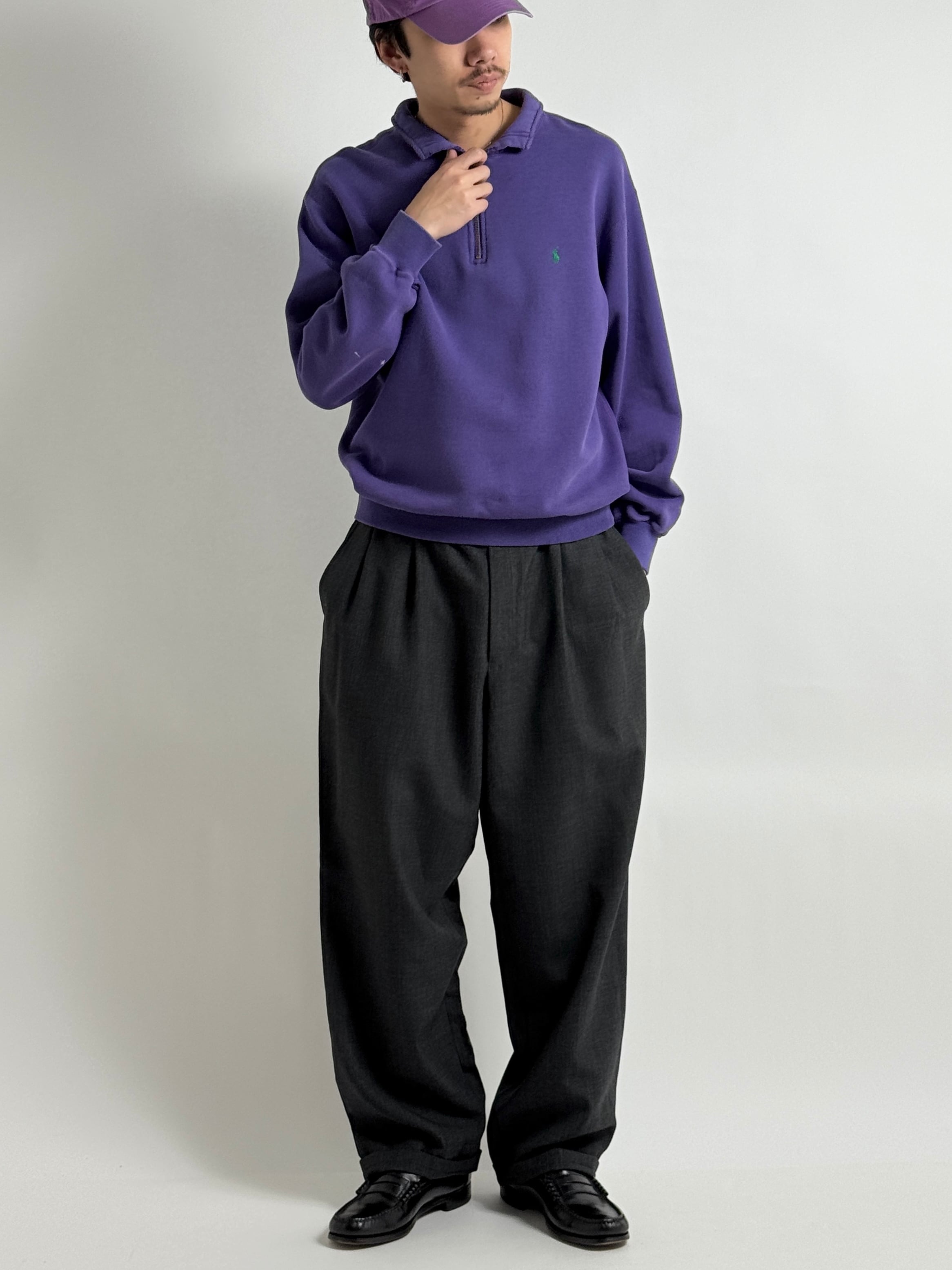 ビンテージのスポーツものでも見かける襟とジップがアクセントなスウェット。